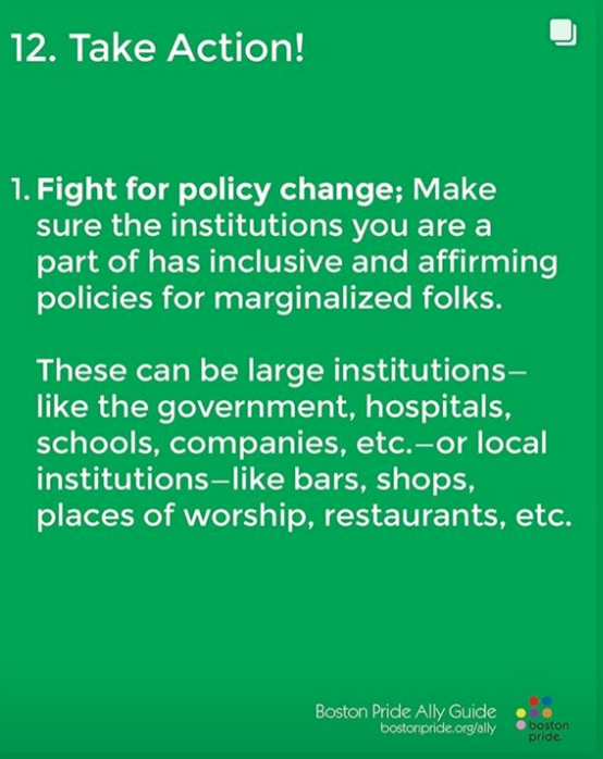 “Allies are CRUCIAL in movements for social change. We are thankful to the estimated one million people, including our straight allies, who joined us at the Boston Pride parade and festival. We know we have more allies today than ever before. This is a guide for all people who want to address forms of social injustices that they do not experience.”