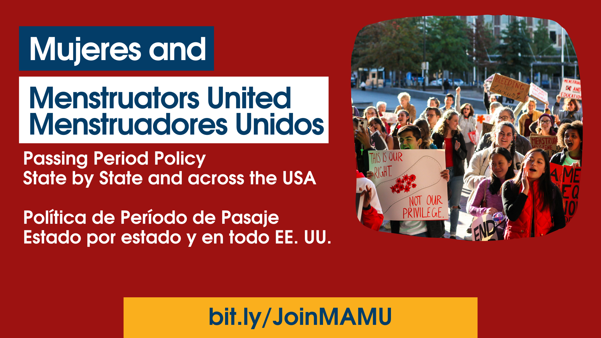 Mujeres and Menstruators United (MAMU) is a new initiative to convene menstrual activists from across the country to strengthen the movement to end period poverty across the country. Our goal is to pass period policy on the local, state & federal level so menstrual products are as universal as toilet paper. At bimonthly coalition meetings we will share resources from menstrual activists on the ground working to pass period policy on the local level and organize our collective power to pass the Menstrual Equity for All Act, recently reintroduced by Congresswoman Meng (D-NY)
